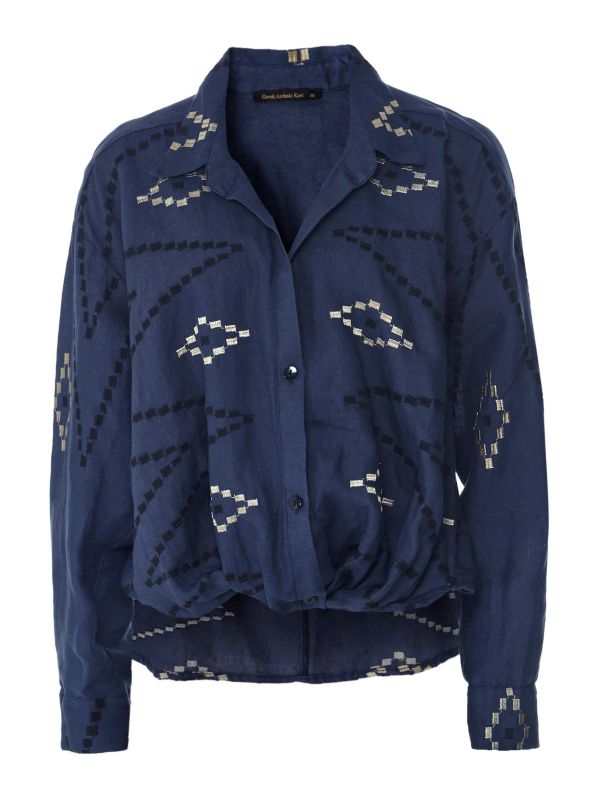 Elevate your linen shirt collection with the Linen Zig Zag Shirt from Greek Archaic Kori. Made in Greece, this soft and lightweight shirt is made from linen. It has a pointed collar, V neckline, contrast button fastening and an embroidered zig-zag pattern. The hem tucks at the front creating a casual, slightly cropped look. Style it with denim or a pair of matching linen trousers.
