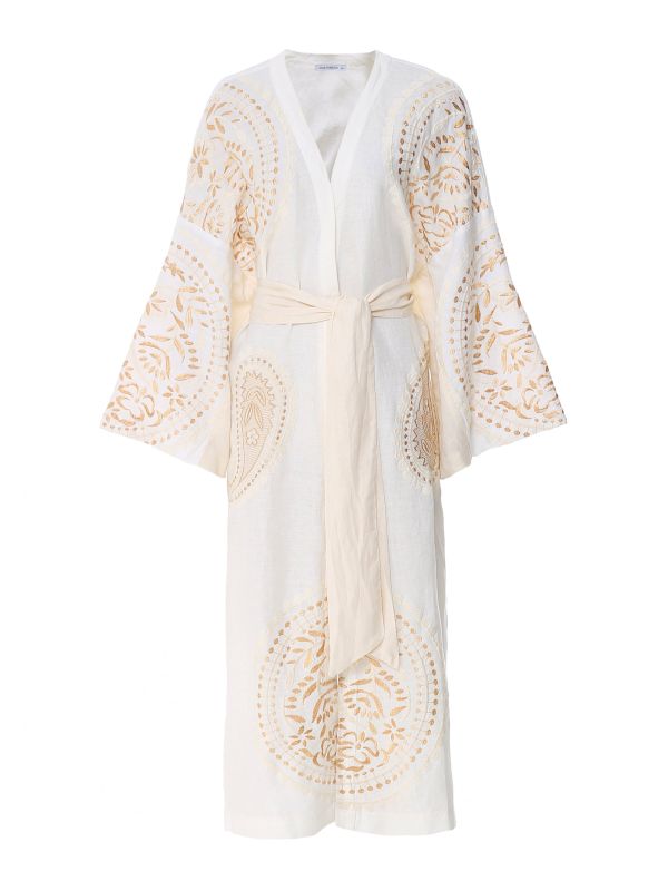 Give your seasonal wardrobe a refresh with the Kori kimono. Beautifully crafted from pure linen, the kimono has been cut to a longline and boasts elegant slits to the sides. Featuring a matching belt, in seam pockets and wide long sleeves, the kimono is complete with paisley embroidery.