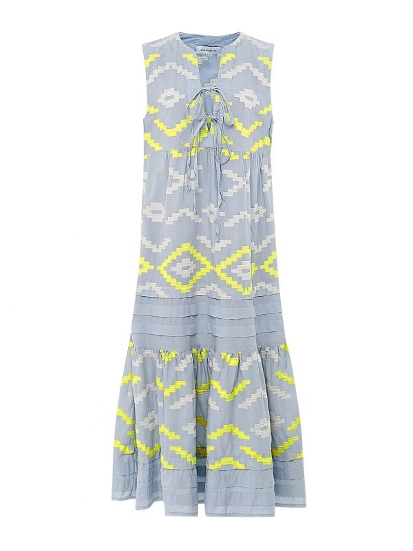 Add a burst of colour into your SS22 looks with the Kori Rhombus dress. Cut to a midi length with a relaxed fit, the Rhombus dress has been beautifully crafted from pure cotton. With a super feminine and flattering v neckline with a double tie detail, the dress is complete with contrasting embroidery throughout.