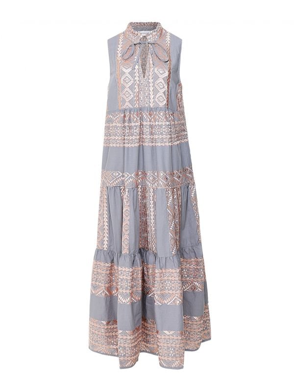 Get a gorgeous summer-ready look with the Kori embroidered maxi dress. Cut from 100% cotton, this versatile number is ultra comfortable and perfect for warm-weather styling. It falls to an elegant long length and features a stand collar, V-neck with tie fastening and beautiful embroidery throughout. Wear this Kori dress with your favourite sandals for an effortless seasonal ensemble.