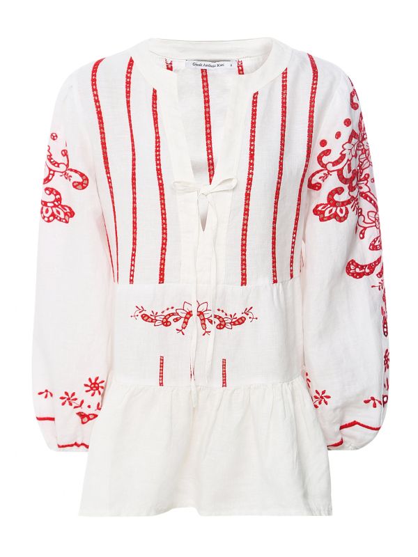 Elevate your summer collection with the Kori blouse, available in a choice of stunning colours. Crafted from pure linen, the blouse boasts delicate embroidery all over. With long loose sleeves and elasticated cuffs, the blouse is finished with a single tier design. Style yours with anything from shorts, to linen pants and skirts.