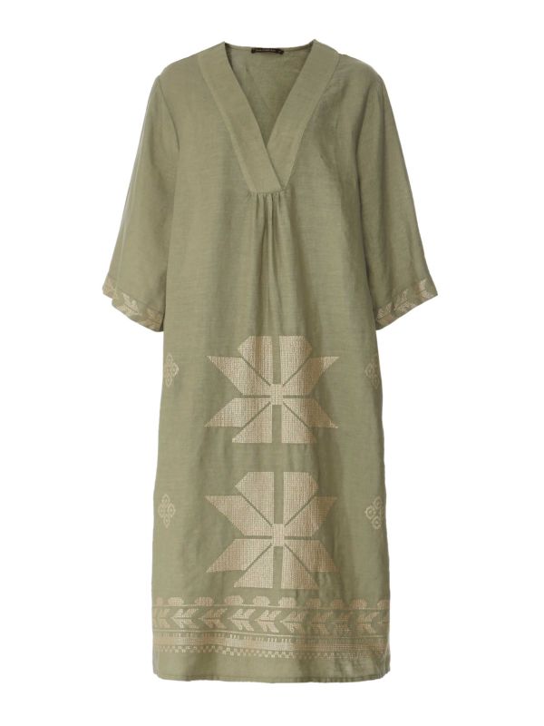 The Greek Archaic Kori V-Neck Embroidered Dress blends comfort and style. This oversized midi dress is crafted from 100% linen and features a V neckline, 3/4 length wide sleeves and side vents to the hem that create freedom of movement when walking. Complete with dazzling gold embroidery to the cuffs and skirt.