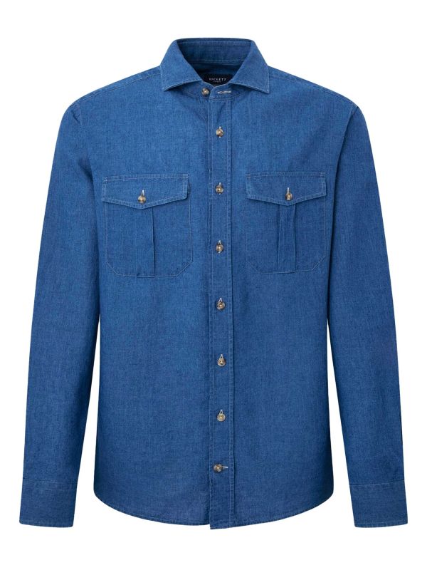 Lend your shirting a relaxed nature with the Hackett denim cargo shirt. Crafted in premium cotton denim, the shirt offers a wonderfully soft handle. Indigo dyed for a denim-like aesthetic, the shirt features a cutaway collar, adjustable cuffs and tortoiseshell buttons, whilst the buttoned chest pockets add workwear-inspired detail.