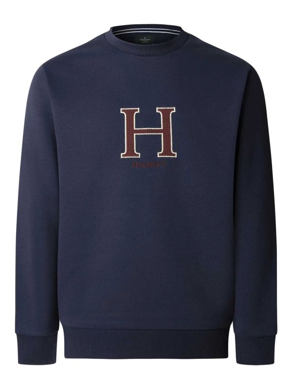 The H Logo Crew-Neck Sweatshirt from Hackett features a large embroidered H to the chest with a small Hackett script beneath, a classic crew neck and ribbed trims at the cuffs and hem. Cut to a regular silhouette with long sleeves, it offers a versatile layering option for weekend and everyday casualwear. The pullover construction creates clean lines and easy wear. Finished with tonal stitching and a neat ribbed collar for a subtle, smart finish, it is ideal for layering under a coat or over a tee.