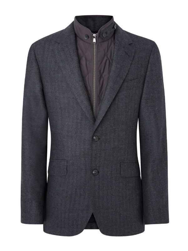 The Hackett herringbone bib blazer is an ideal choice for smart winter dressing. Tailored in pure flannel wool, the jacket features a detachable zip bib for added insulation. Featuring notch lapels with two button fastening, working cuffs and three pocket front, with the herringbone pattern making for a charming aesthetic.