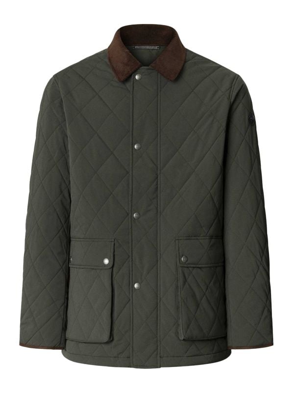 The Quilted Jacket is a smartly tailored outer layer with diamond quilting and a corduroy collar. It features a zip with press-stud placket, flap pockets with snap closures and adjustable back waist tabs for a refined fit. Finished with bound edges, snap cuffs and a subtle Hackett sleeve emblem, it offers lightweight warmth and purposeful detailing for everyday layering over shirts and jumpers. Discover more from Hackett.