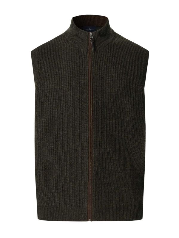 The Ribbed Zip Gilet is a rib-knitted sleeveless layer from Hackett. Cut with a clean, tailored silhouette it fastens with a full zip and features a stand collar that layers neatly over shirts and jumpers. The textured knit fashioned from 100% merino wool gives subtle depth while a contrast zip placket and leather zip pull add considered detail. Wear it over long-sleeve shirts or under a coat for extra warmth and structure. A smartly finished gilet that updates both casual and smart-casual outfits with ease.