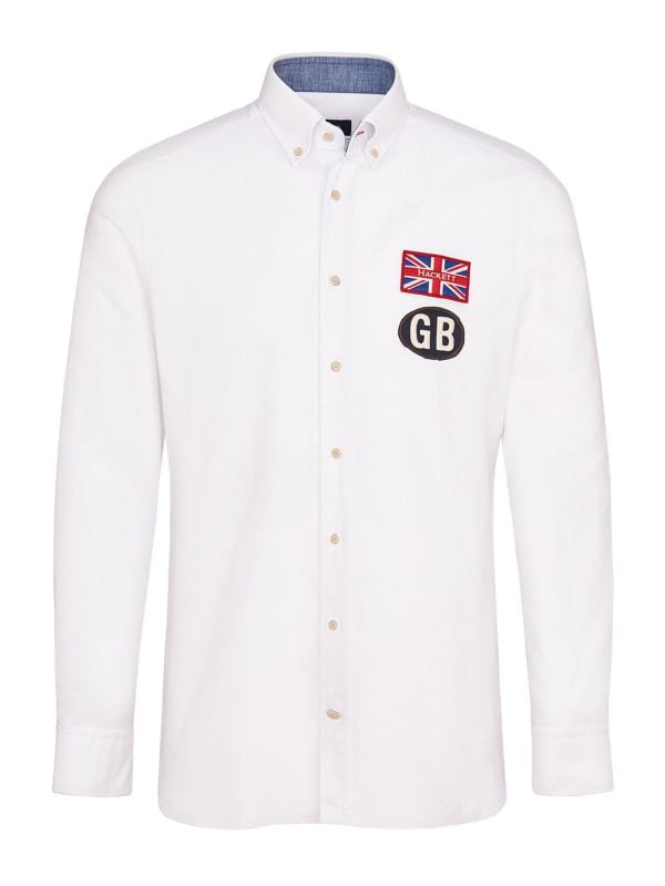 The Hackett GB Badge shirt is ideal for dress down weekends. Cut to a slim fit and crafted in pure Oxford cotton, the shirt offers a contoured silhouette and soft textured handle. Featuring a button down collar, adjustable cuffs and chambray collar lining, whilst the GB badge to the chest gives a nod to the label's British heritage.