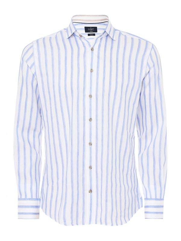 The Hackett herringbone stripe shirt is the perfect option for refined summer dressing. Cut to a slim fit and crafted in a linen and cotton blend, the shirt offers a tailored silhouette and essential cooling qualities. Featuring a smart cutaway collar, buttoned cuffs and branded cuff tape, whilst the herringbone jacquard stripes make for a timeless appearance.