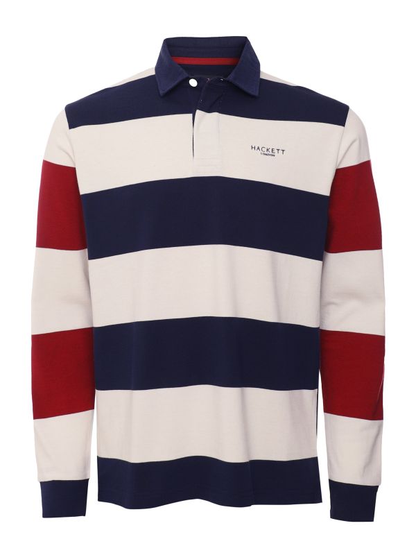 Lend your off-duty attire a sporty edge with the Hackett striped 1983 rugby shirt. Crafted in pure cotton, the polo shirt offers a super soft handle and essential comfort. Featuring a colour-block striped design with concealed button placket and long sleeves, whilst the 1983 maxi logo to the back adds a heritage-inspired finish.