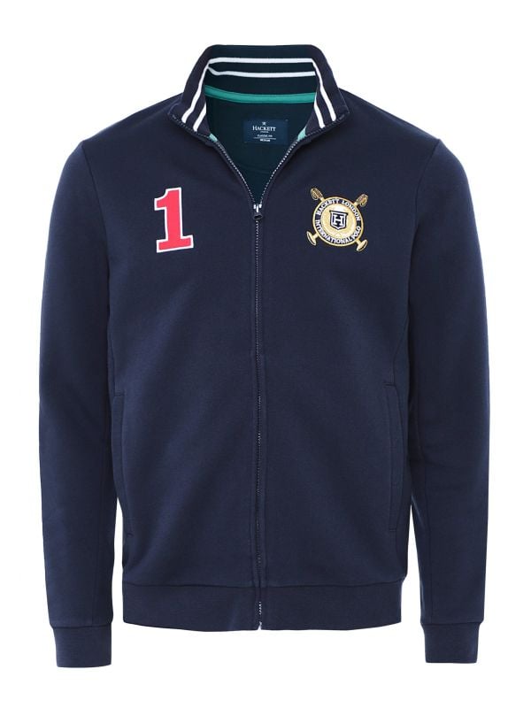 Add sports heritage style to your casual wardrobe with the Hackett No. 1 sweatshirt. Exclusive to Jules B, the navy sweat has been cut to a classic fit and crafted in premium cotton, with the fleece interior ensuring exceptional comfort. Featuring a zip-through fastening, funnel collar and ribbed trims, whilst the side-entry pockets provide handy functionality. The Hackett sweatshirt is complete with embroidered number and crest to the chest for a signature finish.