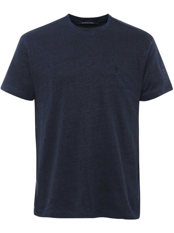 The HandPicked Sadali t-shirt is a refined take on a wardrobe staple, cut from pure linen for a lightweight and breathable finish. Designed with a classic crew neck and short sleeves, it delivers effortless comfort while keeping a sharp look. The subtle embroidered logo adds a touch of detail without overpowering the clean design. Made in Italy and tailored to a regular fit, it’s a versatile piece that works just as well solo or layered.