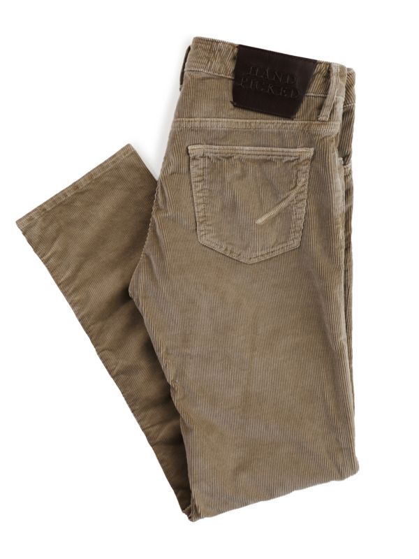 The HandPicked Ravello Corduroy Jeans are a tailored interpretation of casual denim, cut from soft corduroy with a five-pocket design and metal rivet trims. Subtle embroidered detailing on the coin pocket and a debossed leather waistband patch add considered branding, while the lined finish gives structure and comfort. Seasonal texture and a soft hand make them an accessible alternative to classic denim. Designed and made in Italy, they pair equally well with knitwear or a shirt for relaxed smart-casual looks.