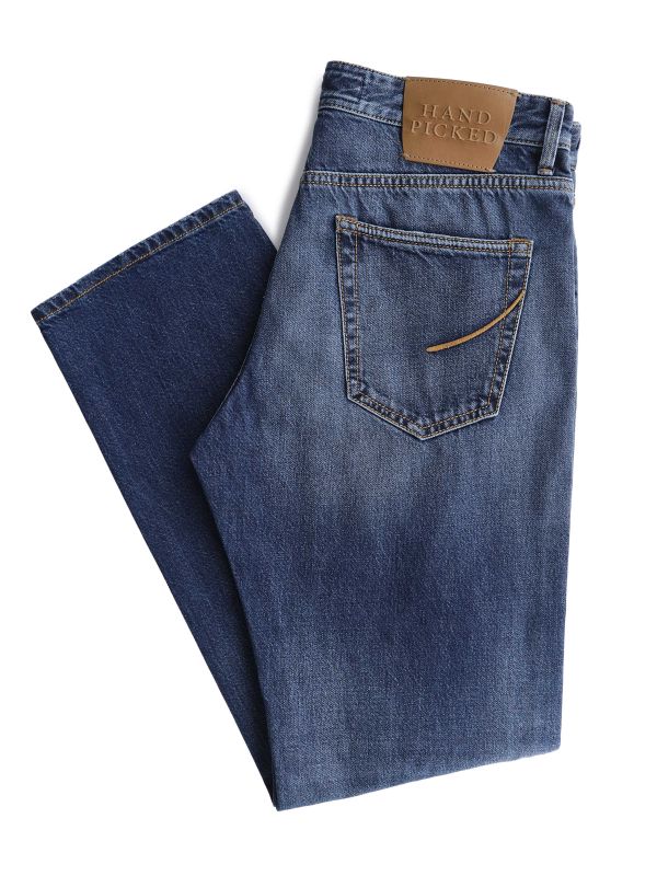 The HandPicked Genova jeans are a wardrobe essential, crafted from cotton stretch for comfort and flexibility. Featuring a mid wash denim, they strike the perfect balance between casual and polished, while the classic five-pocket design, belt loops, and branded waistband tab provide practical style and subtle Italian detailing. Made in Italy and cut to a regular fit, these jeans offer a versatile, comfortable silhouette ideal for everyday wear.