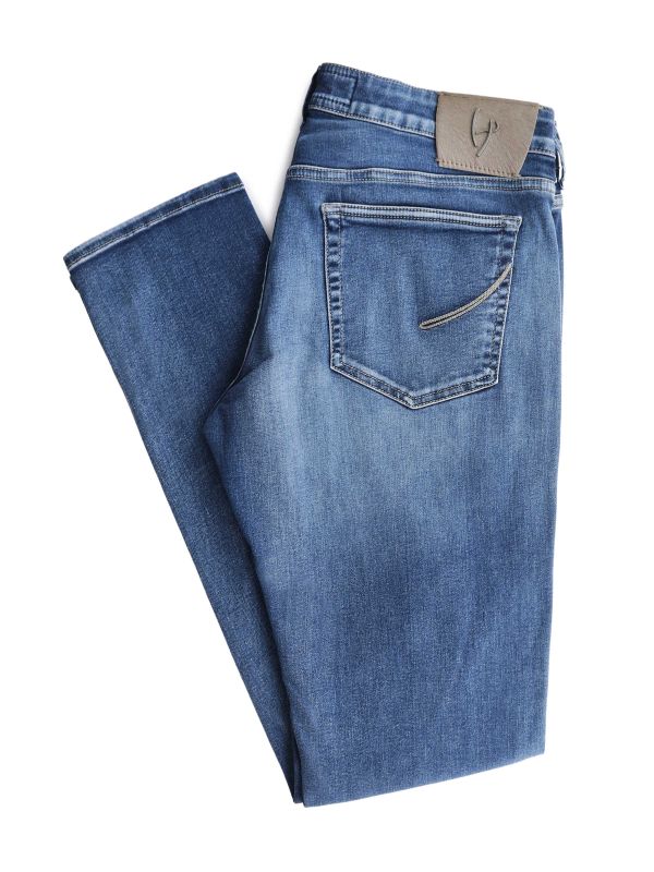 The HandPicked Parma jeans are a relaxed, everyday essential crafted from cotton stretch for comfort and flexibility. The light wash denim gives them a fresh, casual look, while the classic five-pocket design, belt loops, and branded waistband tab add practical style and subtle Italian craftsmanship. Made in Italy and cut to a regular fit, these jeans offer a comfortable, versatile silhouette that works effortlessly for laid-back, stylish outfits.