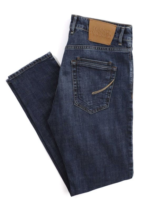The HandPicked Imola jeans are a refined wardrobe staple with a versatile edge. Made in Italy from cotton stretch fabric, they balance comfort with a clean, slim silhouette. The dark wash denim gives them a smart yet casual look, making them easy to dress up with a blazer or down with a tee. Designed with a classic five-pocket construction, sturdy belt loops, and a branded waistband tab, these jeans bring Italian craftsmanship to everyday style.