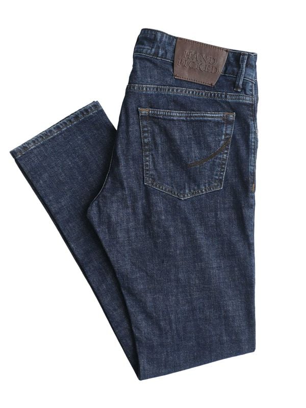 The HandPicked Orvieto jeans are a modern staple, crafted from a cotton stretch blend that ensures comfort and flexibility all day long. Featuring washed denim for a stylish, worn-in look, they come with a classic five-pocket design and branded metal hardware for subtle, high-quality detailing. A branded waistband tab adds a refined signature touch. Made in Italy with a slim fit, these jeans offer a sleek, contemporary silhouette perfect for casual, everyday style.