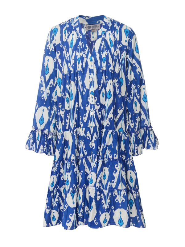 The Dream Lobster dress reinvents the standard summer mini dress. Constructed from 100% cushy cotton for classic comfort, paired with the vibrant 'Minx Ikat' print, elevates this look. This piece features a flattering v-neck with mother-of-pearl style button details and ruffle cuff sleeves with matching ruffle details on the tiered skirt.