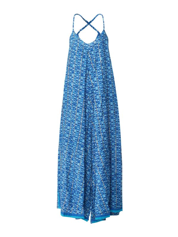 The Rio Jumpsuit is a striking style created by Handprint Dream Apparel. This jumpsuit is crafted from viscose and has a loose, floaty fit with a slightly fitted top and an oversized wide leg. It has a rounded neckline, adjustable spaghetti straps which cross at the back and handy side pockets. The standout feature is the all-over circle print complete with shimmering gold stripes and blue fabric ribbon trims. This fun fit is perfect for summer plans.