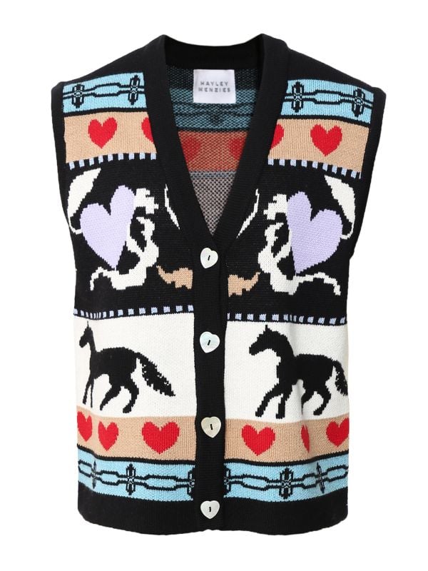 The Hayley Menzies Annie vest is a statement piece of knitwear to elevate your everyday wardrobe. Boasting a stylish jacquard woven design, it features a V-neck, mother-of-pearl heart buttons, a quirky western-inspired motif and a cropped fit.