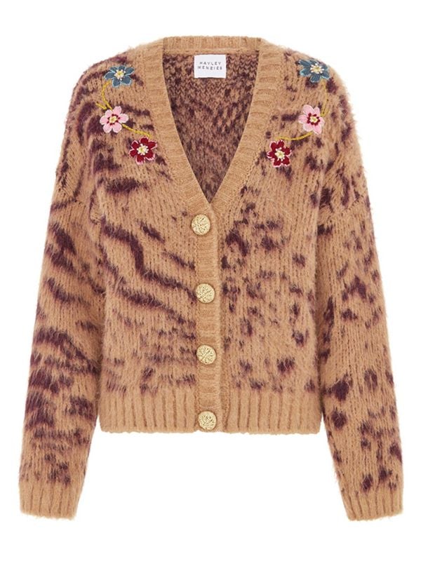 The Hayley Menzies Big Meow alpaca cardigan is the ultimate winter knit to upgrade your wardrobe. Made from a brushed alpaca wool blend, the cardigan has a rounded V neckline, ribbed trims, hand-embroidered flowers to the shoulders and large gold non-functional buttons to the front. It has a relaxed fit and full-length sleeves.