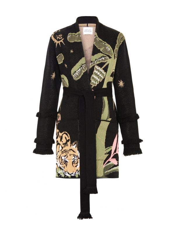 Get a chic standout look with the Hayley Menzies Drinking Tiger cardigan. Featuring a tropical-inspired tiger print beneath a twinkling night sky, this charming cardigan can be worn open or closed over your favourite ensembles. Taking over 7 hours to create, this unique piece is crafted using a complex jacquard knitting technique and is complete with a self-tie waist belt, deep pockets and laid-back silhouette.