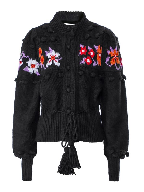 The Hayley Menzies Genevieve cardigan is a beautiful piece of knitwear sure to elevate your off-duty wardrobe. Crafted from a luxurious wool blend, this chunky knit features a button closure, crochet flowers, tie belt with tassel detail and ribbed trims.