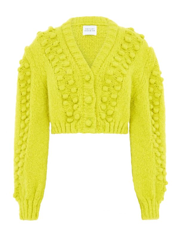Elevate your knitwear with the Hayley Menzies Gloria cardigan. This statement cropped knit is crafted from an ethically sourced alpaca wool blend and boasts an oversized silhouette with dropped shoulders and dramatic sleeves. The cardigan features fun pom pom details throughout and is complete with rib-knit cuffs and hem.