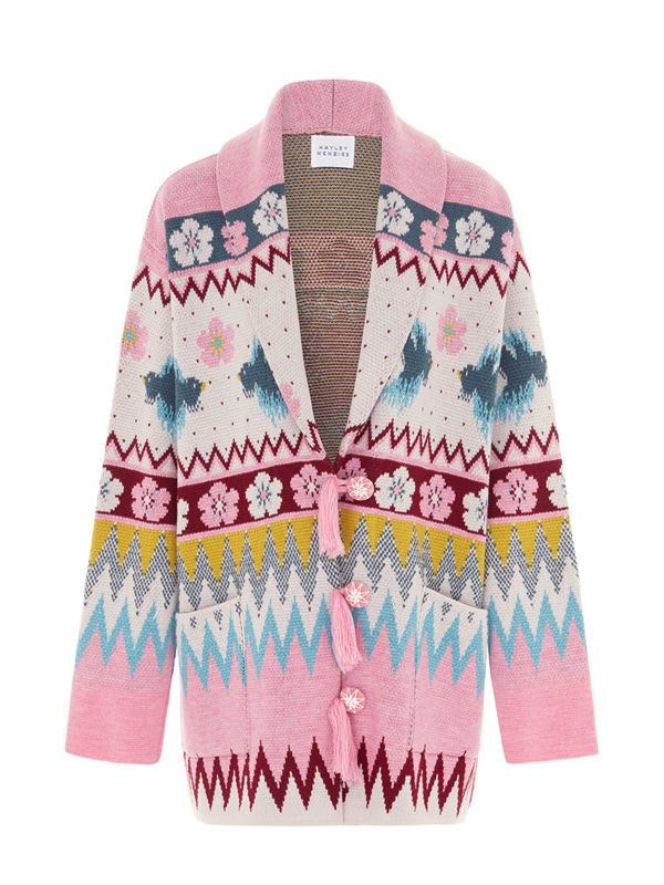 The Hayley Menzies Charming Birds cardigan is a must-have layer for the early autumnal days. Lovingly crafted in ethically sourced merino wool, the cardigan ensures superb comfort and essential warmth. Featuring a shawl collar with tassel fastening buttons, drop shoulders for an oversized fit and patch pockets, whilst the jacquard pattern lends a whimsical aesthetic.