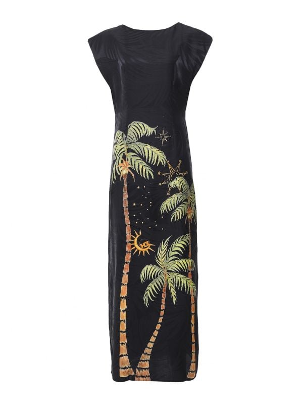 The Hayley Menzies Palmeiras dress is a must-have investment piece that will stay with you for years to come. Impeccably crafted from pure silk, the dress offers a super unique and flattering deep v back. Featuring a scalloped placket to the back, gold snap buttons and a palm print all over, allow yours to carry you from day to night and style it with anything from sandals to heels.