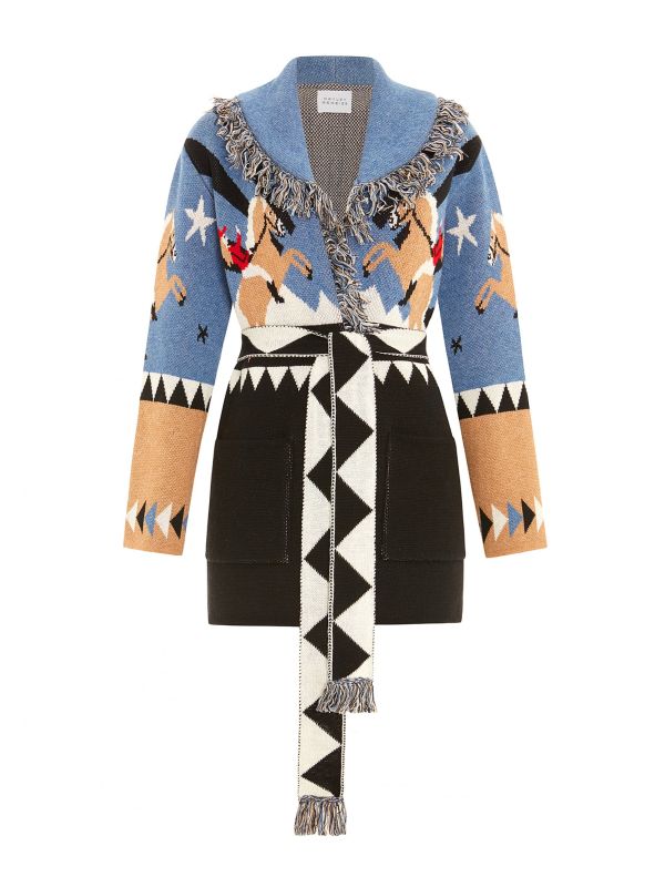 Add a dose of rebellious style to your everyday wardrobe with the Hayley Menzies Sunrise Rodeo cardigan. This beautiful knit is made from a luxurious blend of Italian merino wool and cotton, ensuring a super soft feel and comfortable fit. It features a self-tie waist belt, deep pockets, fringed detailing and a fun cowgirl motif, and can be worn open or closed for a versatile look.