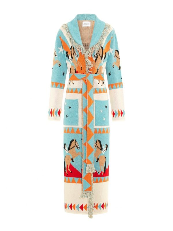 Get a stylish statement look with the Hayley Menzies Sunrise Rodeo cardigan. Whether teamed with your favourite denim or your go-to loungewear, this bold longline cardigan is a must-have piece, having been expertly crafted in a luxurious blend of super soft Italian merino wool and cotton for an ultra cosy and comfortable fit. It can be worn open or closed and features a self-tie waist belt, deep pockets, fringed detailing and a unique cowgirl motif.