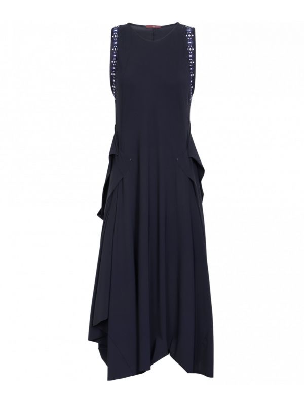The High Accentuate dress is an elegant and wonderfully versatile piece for your Spring/Summer wardrobe. Made from a soft and smooth stretch fabric, this slip on sleeveless dress will keep you cool on warm days. It features a round neckline bound in self fabric, geometrically patterned stretch rib armholes and diagonal pleats that drape into a soft "double-bustle" at the back. Team this sophisticated dress with sandals for an effortlessly chic summer ensemble.