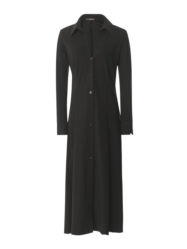 The High Audacious dress is the perfect black shirt dress made from a soft stretch fabric for exceptional comfort. It has a pointed collar and V neck with button fastenings to the front. It fits slightly slim at the waist before opening into pleats at the skirt, making for a flattering silhouette. Side vents contribute to its relaxed movement when walking.