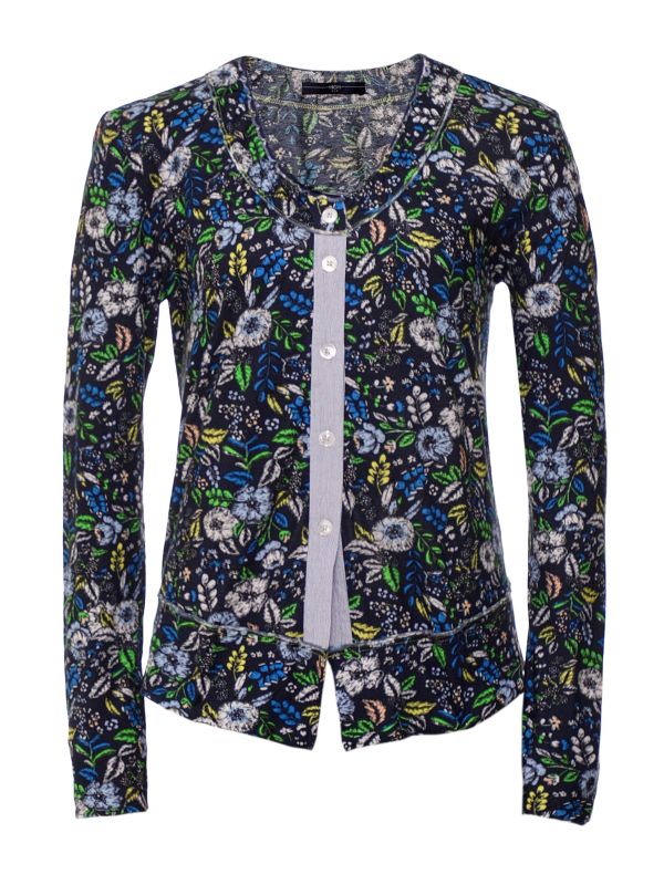 The High Imagine cardigan is a fitted style cut from navy cotton jersey with an all-over floral pattern. This chic staple piece features a round neckline with ruffle collar, mother-of-pearl buttons, a pinstripe woven cotton placket and long sleeves. Layer it over a casual dress for an effortless everyday look.