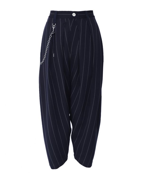 Get the ultimate smart-casual look this season with the High Pair Up pants. These navy blue pinstripe pants are constructed in a fine polyester rayon mix and feature a button fastening and tech tape belt loops. With pleated details, side pockets, two jetted back pockets and a curved outside leg that tapers into a narrower cropped hem, these elegant pants are a must for your everyday wardrobe.