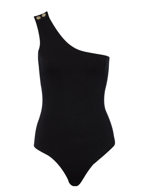 A Holland Copper bodysuit is essential in every modern woman's wardrobe. Beautifully crafted from super soft fabric, the bodysuit has been cut to a hugging bodycon fit. Featuring a one shoulder design and gold crested rivets to the shoulder, style yours with anything from jeans to denim shorts and mini skirts.