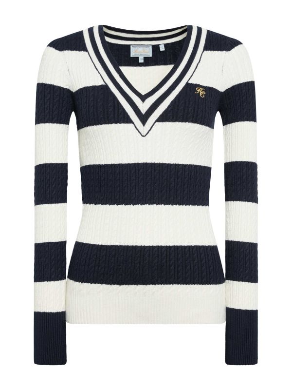 The Badminton Knit by Holland Cooper features a cable-knit construction and a deep V-neck finished with twin ribbed trim for a sporting edge. A tonal embroidered HC crest sits to the chest, while ribbed cuffs and hem provide structure. Long sleeves and a contoured shape create a neat silhouette that's ideal for layering under blazers or pairing with high-waisted Pants and denim. Wear it alone or tucked into skirts for a composed, architectural finish that suits both office and weekend wardrobes.