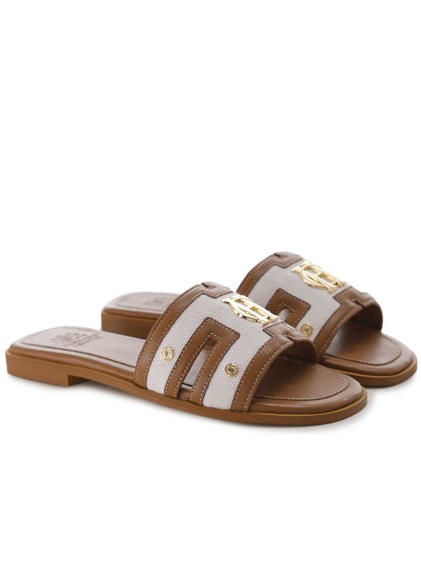 Slip into comfort with the Canvas Monogram Slides by Holland Cooper. Constructed from soft leather with a contrasting canvas strap and cushioned sole, they're the ultimate summer style for wearing on repeat. These Holland Cooper sandals feature stylish rectangular cut-out details on each side of the strap and are finished with the iconic gold HC monogram and rivets.