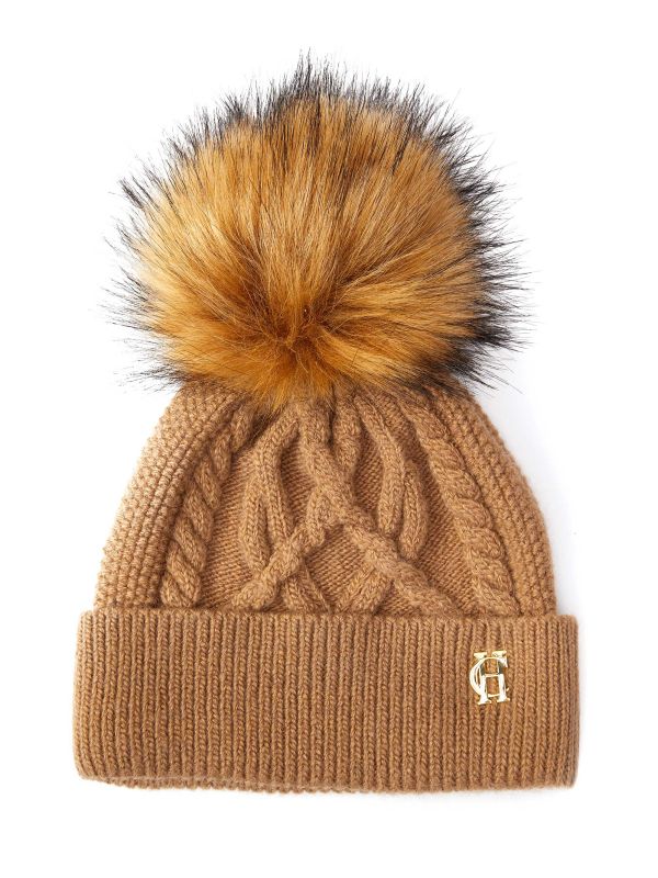 Accessorise in style with the Holland Cooper Cortina bobble hat. This beanie hat has a cable-knit design with a large, detachable faux fur bobble on the top. It has a ribbed hem with a shiny gold HC pin to finish.