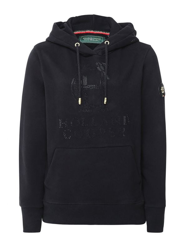 Add a touch of luxury to your off-duty wardrobe with the Holland Cooper Essential hoodie. Crafted in a comfortable cotton blend with an adjustable drawstring hood, this relaxed hoodie is perfect for everyday wear. It features crystal embellished graphics on the front and hood, embossed gold-tone hardware and a logo patch to the sleeve for an authentic finish. Team with your favourite denim or joggers for a cool, casual look.