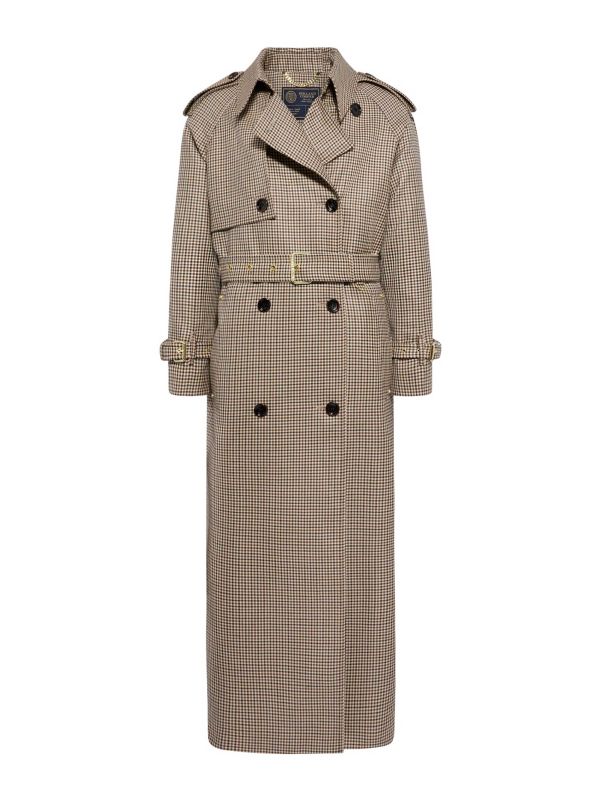 The Full Length Soho Trench Coat from Holland Cooper is a double-breasted coat tailored for extended coverage. Cut to a full-length silhouette, it features a belted waist with gold-tone buckle, classic epaulettes and a storm flap across the chest. Functional cuff straps and button fastening provide adjustable shaping, while side pockets offer everyday practicality. The coat is presented in a fine houndstooth check and finished with contrasting buttons and metal trims. Wear it over knitwear or tailoring for a polished outer layer with structured lines.