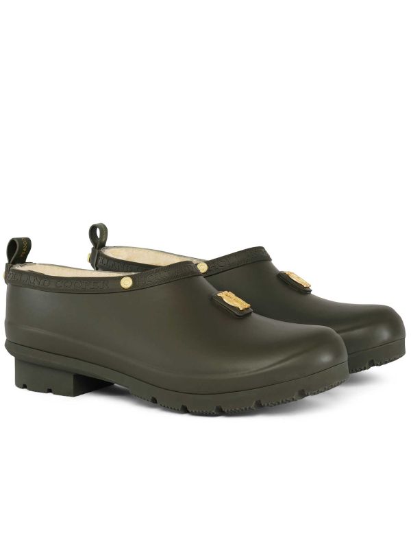 The Gardening Loafer by Holland Cooper is a rubber slip-on shoe lined with plush pile for Cozy comfort. Signature branded trim and gold studs frame a gold monogram plaque at the vamp, while a low stacked heel and lugged sole provide dependable grip. A pull tab at the heel aids entry and a debossed Holland Cooper script encircles the collar. Practical for damp conditions yet finished with considered detailing, this design offers an easy-to-wear outdoor option with a premium feel.