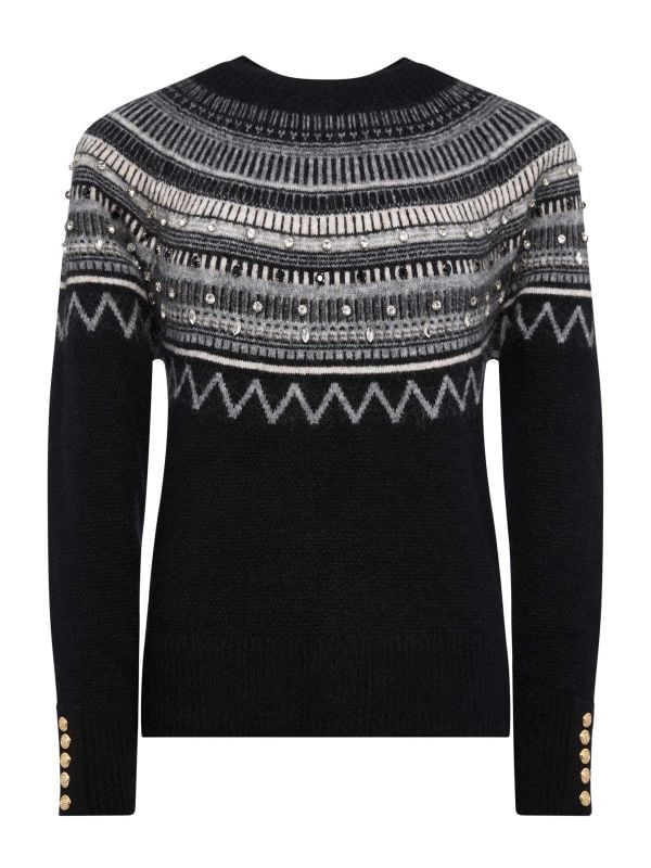 The Holland Cooper Jasmine Crew Neck Knit Jumper features a Fair isle patterned yoke finished with sparkling embellishments. Cut with a classic crew neckline and long sleeves, it has ribbed trims at the hem and cuffs and gold button detailing at the cuff for a polished finish. The jacquard-knit motif sits across the shoulders and upper chest, adding texture and visual interest. Layer over a shirt or under a coat for cool-season dressing; pair with jeans or tailored trousers for an easy, considered look.