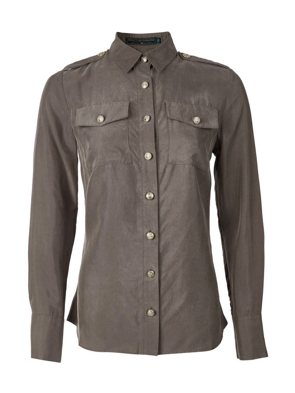 The Holland Cooper luxury cupro shirt is an essential piece for your everyday wardrobe. Cut from a cupro blend fabric for a super soft feel, this elegant slim fit blouse is perfect for tucking into your favourite jeans. It features a button down fastening, long sleeves with buttoned cuffs, military-style chest pockets and shoulder epaulettes and signature crested gold-tone metal hardware for a lustrous finishing touch.