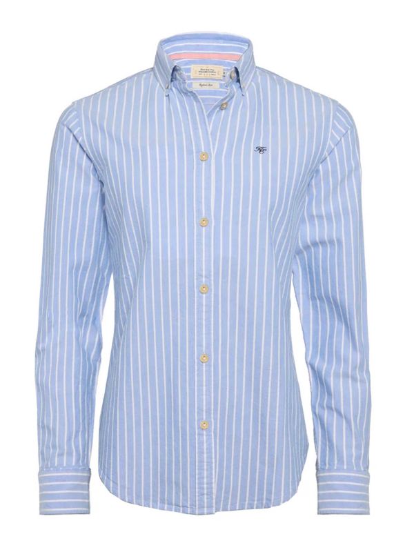 The Holland Cooper Oxford Stripe Shirt is a button-through shirt crafted in classic Oxford styling. It features a button-down collar, long sleeves, a curved hem and a neat embroidered logo at the chest. Finished with front buttons and single-button cuffs, the shirt has a tailored yet relaxed silhouette that layers well under blazers or pairs back with Pants. Subtle stitched detailing and a small metal logo on the back yoke add signature Holland Cooper character, making it easy to dress up or down.