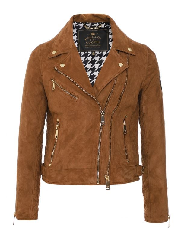 Add a cool modern edge to your everyday looks with the Holland Cooper biker jacket. Crafted in super soft suede leather, this butter-soft jacket is an ultra comfortable and stylish option for off-duty styling. It features a double zip closure, three zippered pockets and is trimmed with lustrous gold-tone hardware, branded details and a distinctive houndstooth print lining for a luxe finish.
