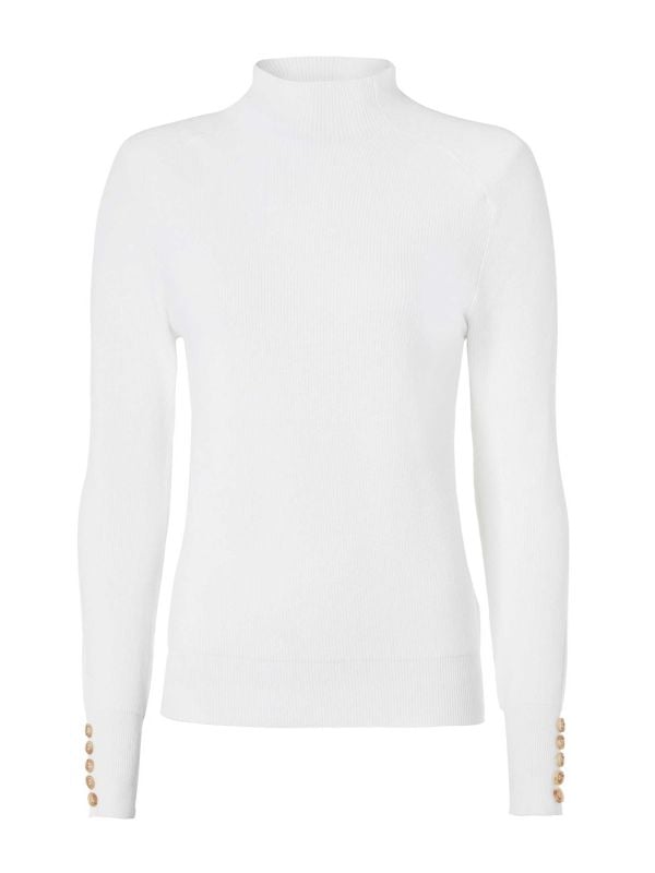 An elevated essential, discover the Tara High Neck Knit by Holland Cooper. This rib-knit Holland Cooper jumper has a high neckline, raglan sleeves and horn rivets on the cuffs. With its slim-fit body, this knit is perfect for styling with jeans and trousers and curating flattering looks. Stylish and versatile, it is a refined piece for any collection.