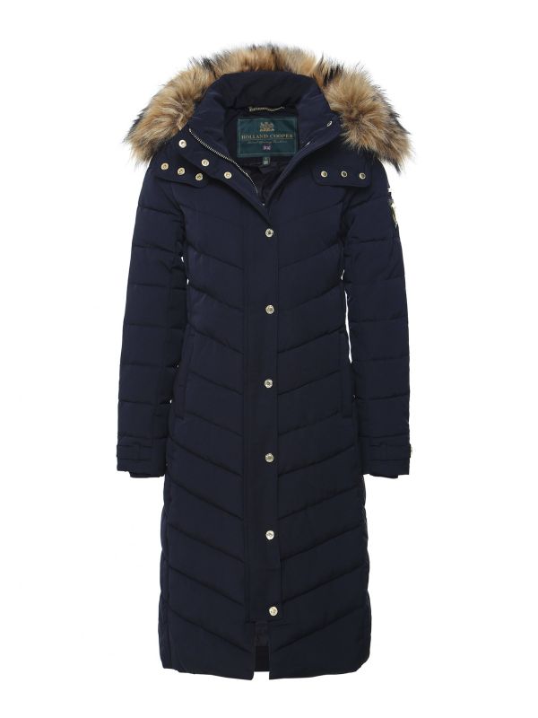 The Holland Cooper Wellington coat is designed with a fashion-forward aesthetic in mind and functionality at its core. This versatile and sophisticated piece of outerwear has a lustrous quilted shell with wind and water-resistant qualities, offering optimum protection against the elements. This classic piece also features a two-way centre front zip fastening with storm guard, fixed hood with detachable faux fur trim, two fleece lined pockets, eco-friendly fill and iconic gold-tone hardware - perfect for cosying up on cold days or taking on your next ski trip.