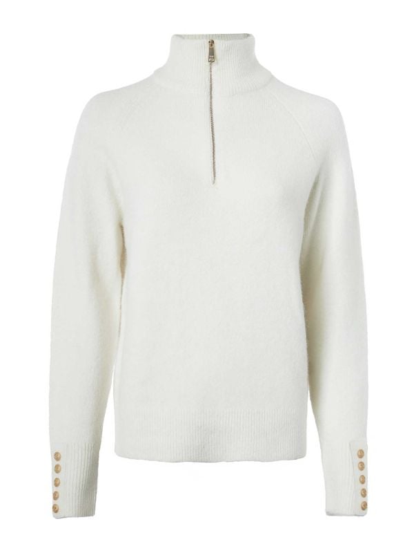 The Tori Half Zip Knit from Holland Cooper is a soft cosy sweater crafted from an alpaca blend. Featuring a roll neck with a handy zip closure, the sweater can be styled in a number of ways to create different looks. This classic knit has ribbed cuffs and hems and modern elements including the brand's iconic gold hardware and rivets to the cuffs.